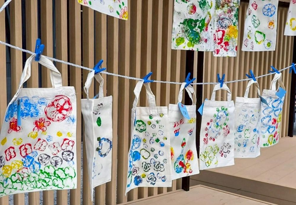 「これ何の野菜?」「レンコンがいい!」など野菜が会話に登場しつつ、野菜スタンプでのオリジナルエコバックづくりを皆さん楽しまれていました。