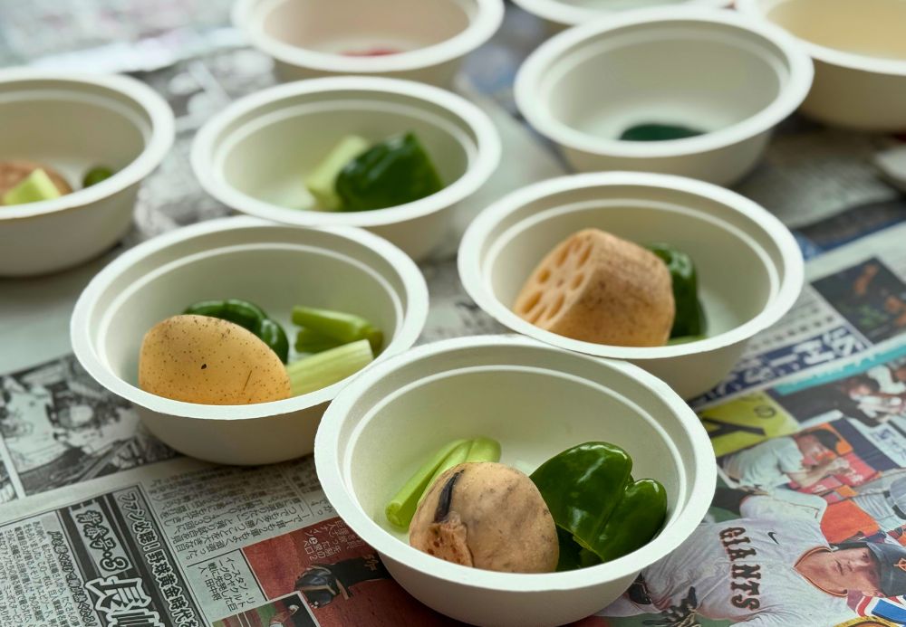イベント当日は、レンコンやピーマン、ネギ、コマツナ、オクラを使って野菜スタンプを行いました。