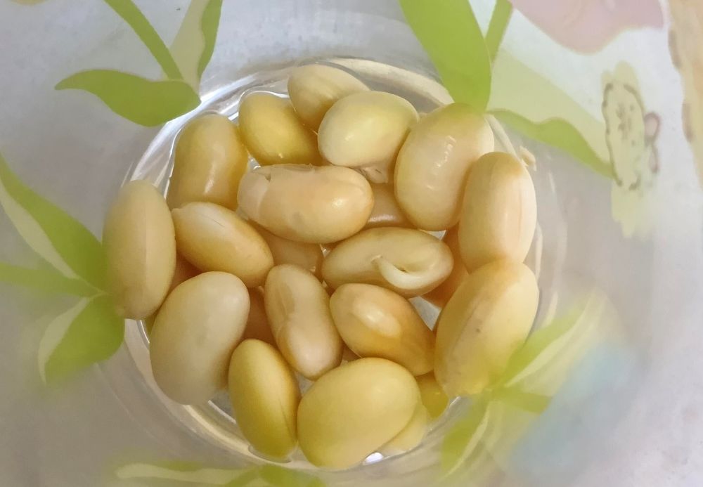 もやし栽培中。大豆から芽がちょっとだけ出ている