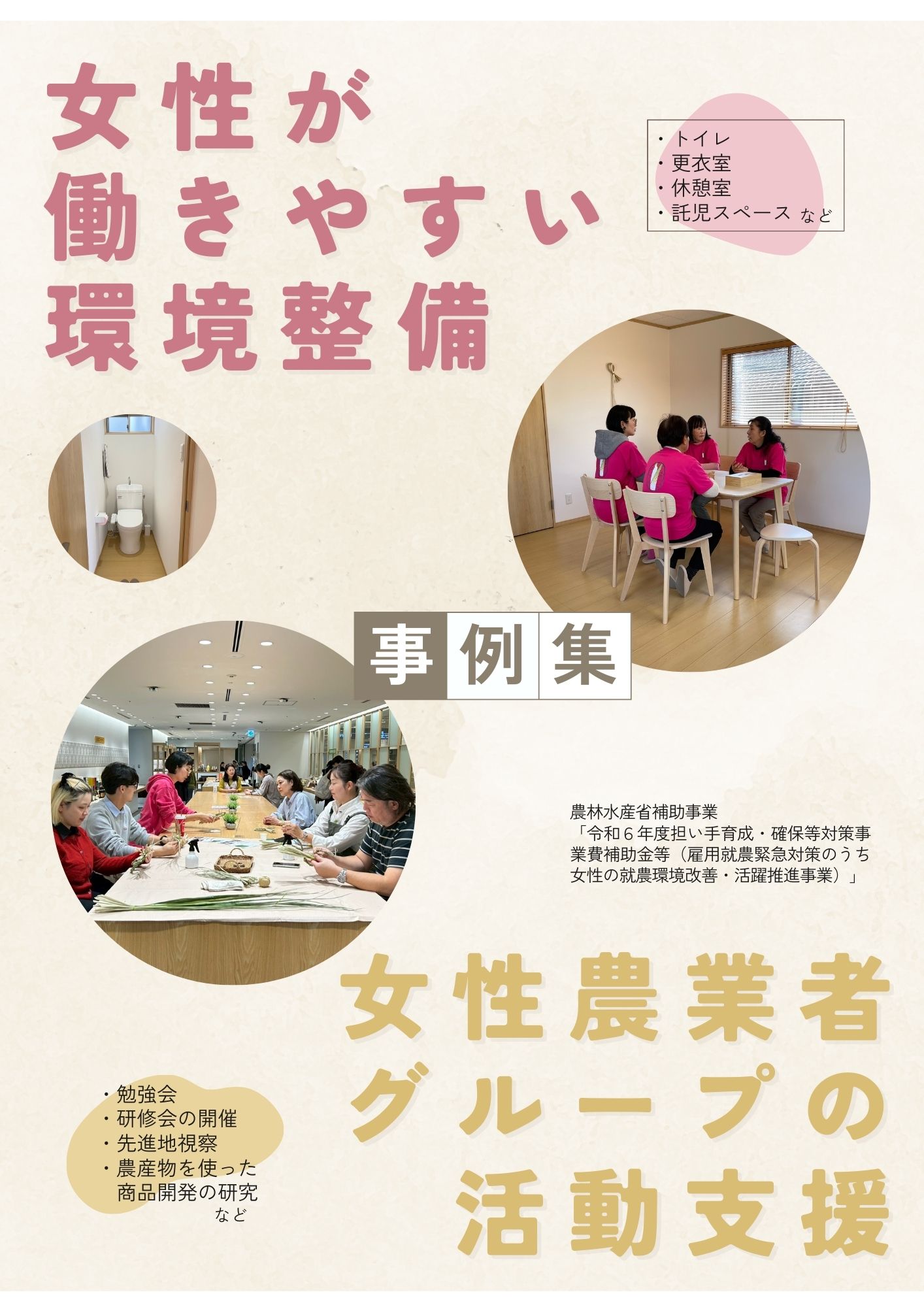 事例集では、上記分野から女性が働きやすい環境整備の事例を3つ、女性農業者グループの活動支援の事例を2つと特集ページを掲載しています。